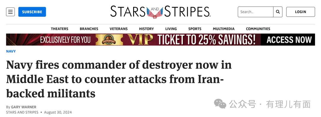 當地時間8月30日,美國軍方媒體《星條旗報》刊文稱,海軍於上週五解僱了一艘導彈驅逐艦的指揮官,這艘驅逐艦是部署在中東的一個航空母艦戰鬥羣的一部分,而該戰鬥羣的任務是反擊伊朗支持的也門胡塞武裝對波斯灣航道的襲擊。