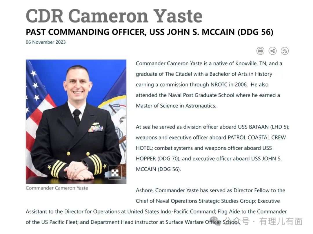 本次被解僱的艦長名為卡梅倫·亞斯特(Commander Yaste),畢業於美國陸軍學院獲歷史學文學學士學位,2006年參加美國海軍預備役軍官訓練團,後於海軍研究生院取得航天科學碩士學位,中校軍銜。