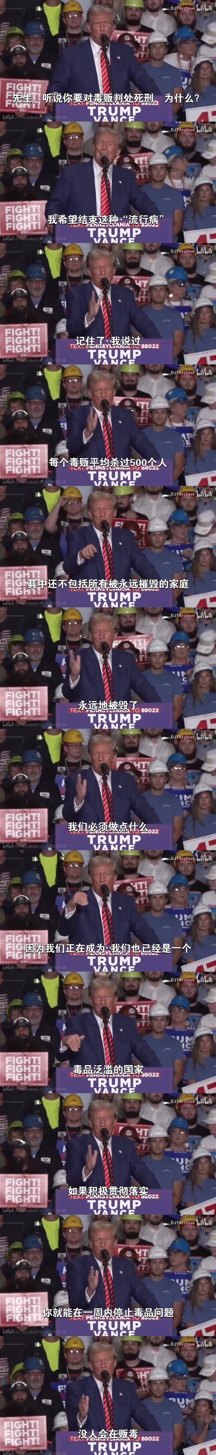 隨後特朗普提出了自己的政治觀點,那就是判處毒販死刑,因為每個毒販平均殺死了超過500人,這還不包括那些被永久摧毀的家庭,如果想結束毒品這種流行病就要判毒販死刑,這樣你在一週內就可以解決毒品問題。