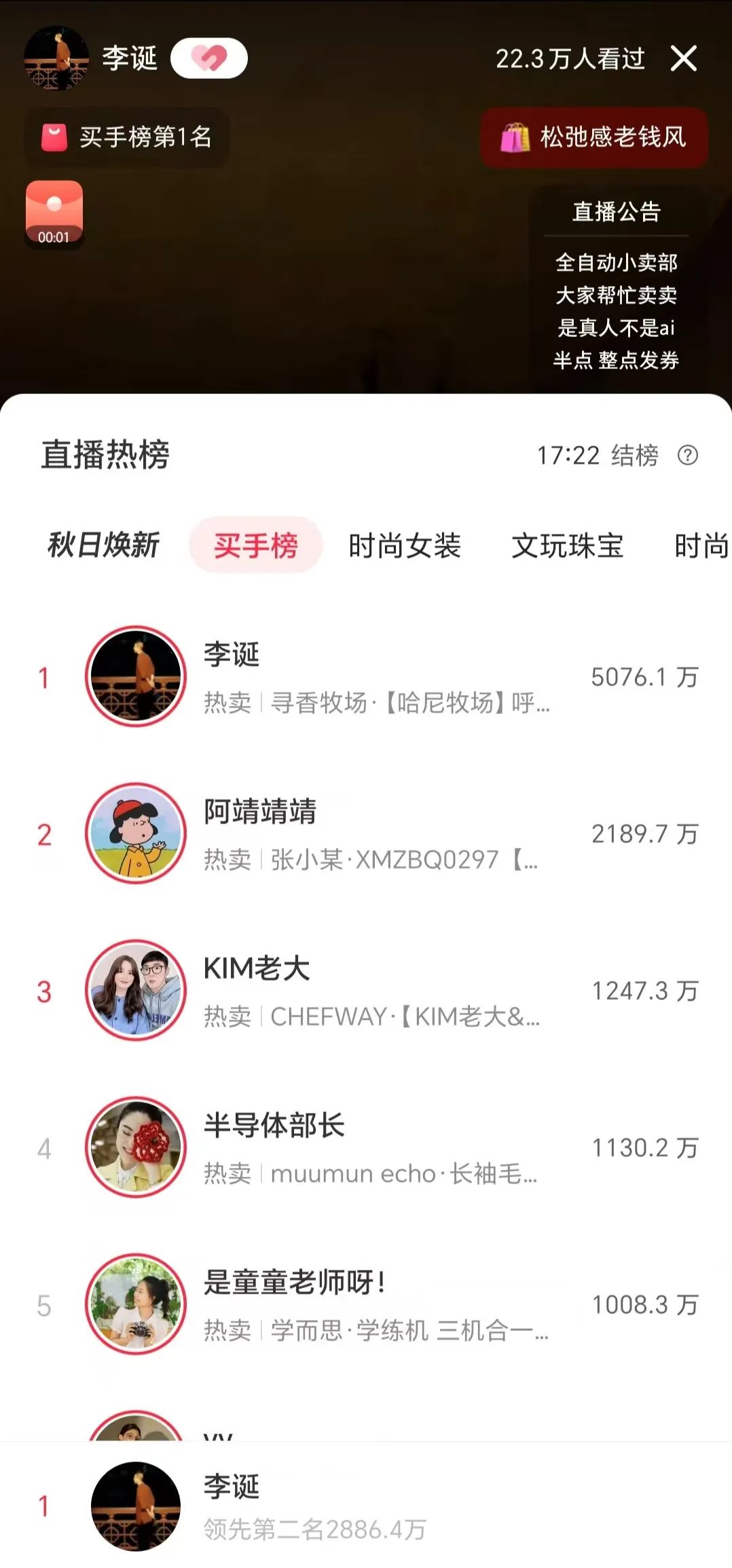 “只要李誕開播,幾乎都能登上小紅書買手榜的第一名,且榜單指數遠超第二名”,一位經常看李誕直播的用户説。