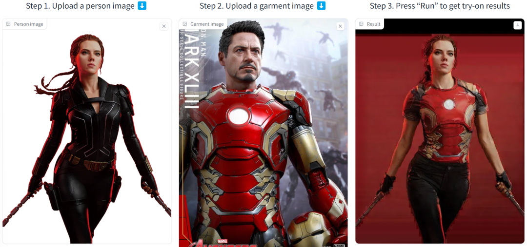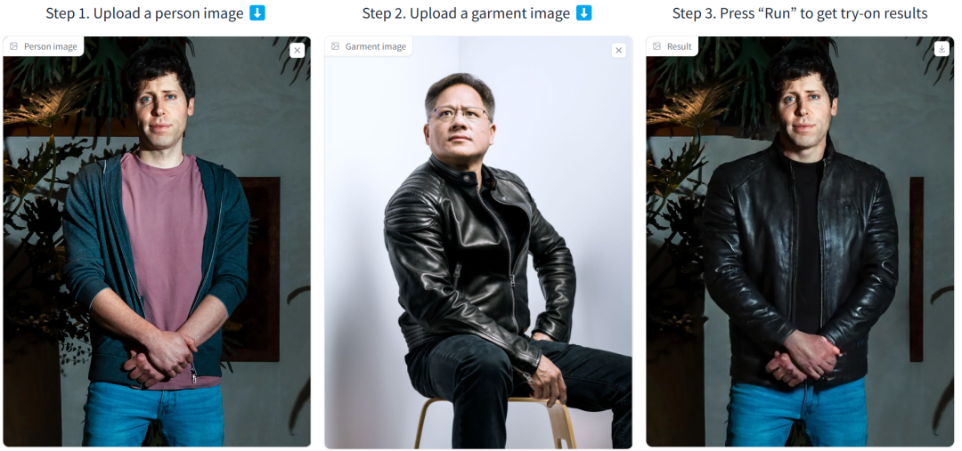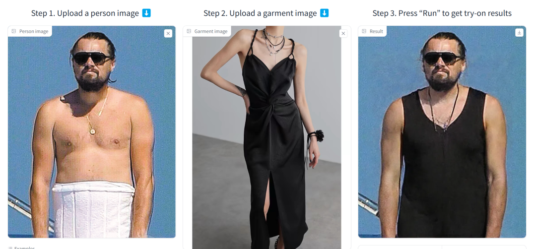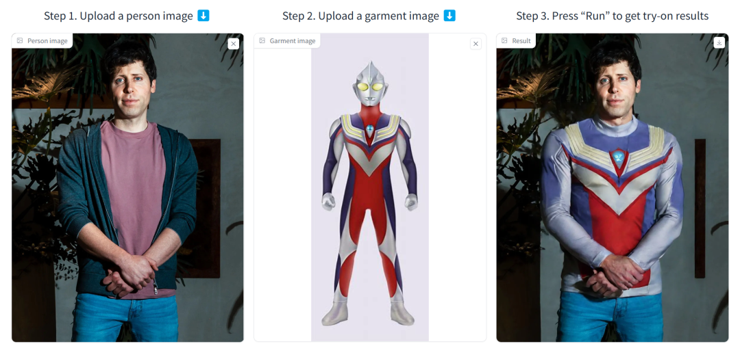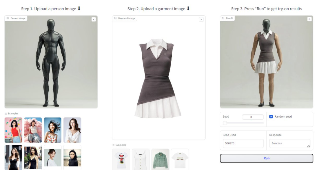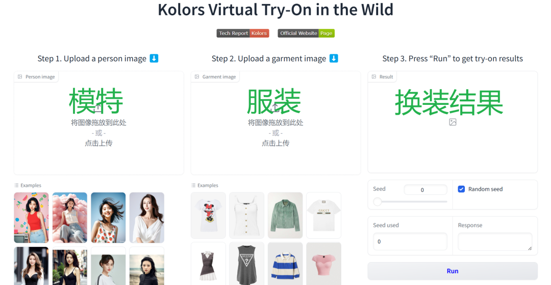 在操作這塊兒,可圖也沒給這個功能整太多要調的參數,基本就是 “ 傻瓜操作 ” 。左邊放模特圖,中間放要換的衣服,點 “ Run ” 就能生成結果。