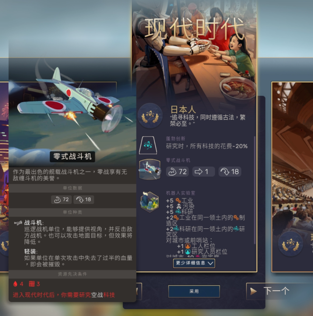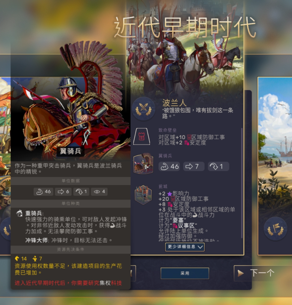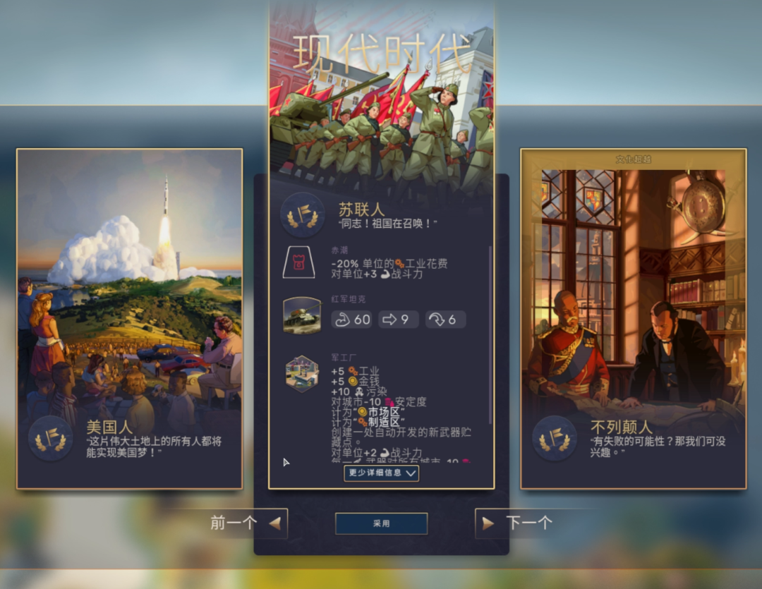 其次,玩家不必再操作單一文明玩到死。在時代末尾,遊戲會提供幾個新文明選項供玩家挑選,經過“變身”或“轉職”,獲取新文明的特色天賦、單位或建築,繼續下個時代的征程。