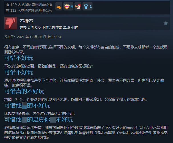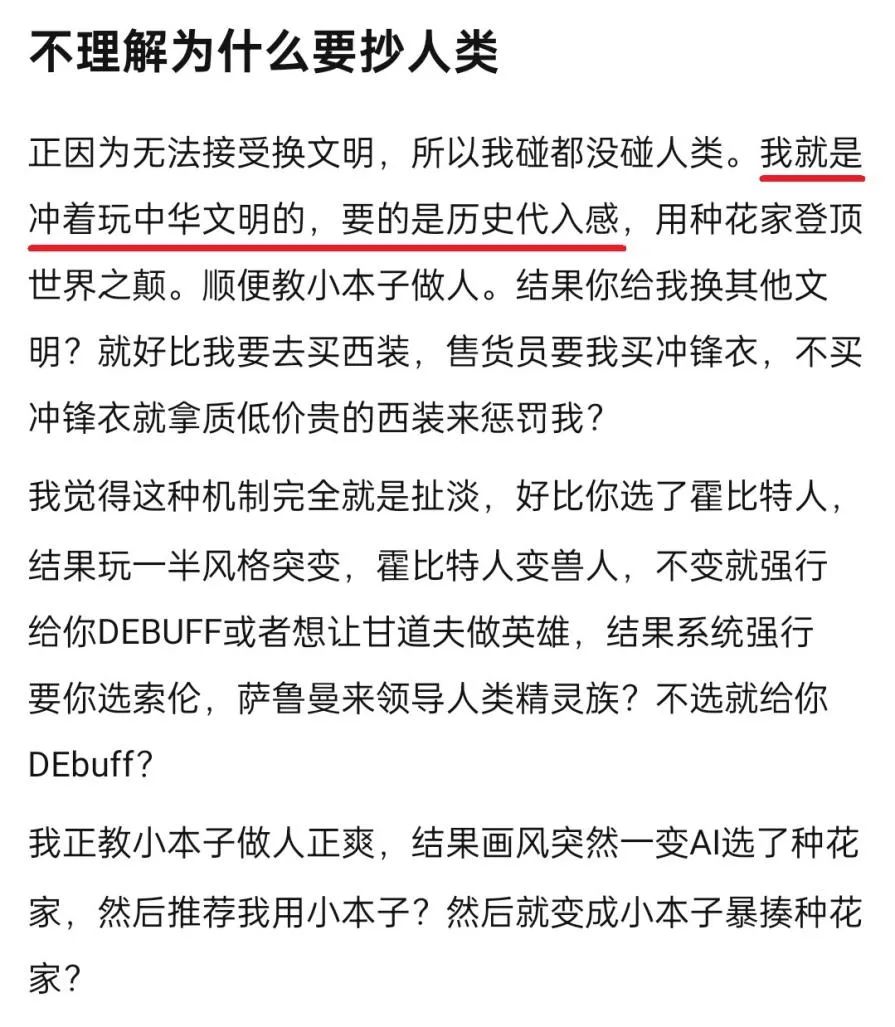 當然,將《人類》低迷的人氣完全歸咎於封禁或“轉職”機制絕對有失偏頗。許多《人類》的粉絲享受變身帶來的新鮮感,並不在意“轉職”帶來的文化斷層。這些粉絲和討厭“轉職”機制、注重代入感的玩家沒少在社區討論中對噴,儘管他們可能同時都是《文明》的愛好者。