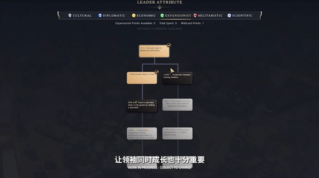玩家在遊戲開始選擇的領袖不會變動,他們更像是前作中領袖、偉人和總督的集合體,擁有獨立的天賦樹和成長機制,以此讓文明的發展路線更加連貫。