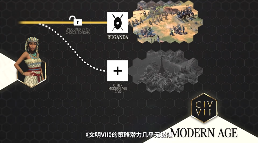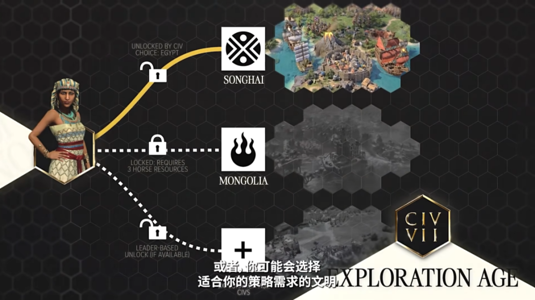 根據宣傳片裏的演示,像古典時代的埃及文明只有兩三個“轉職”文明可選。第一個是桑海文明,和埃及同在非洲。