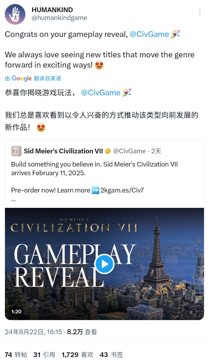 別説是玩家了,就連《人類》的官方賬號都在X上轉發了《文明7》的宣傳片,並附言“恭喜你揭曉了玩法”,多少有些陰陽和嗆聲的意味。