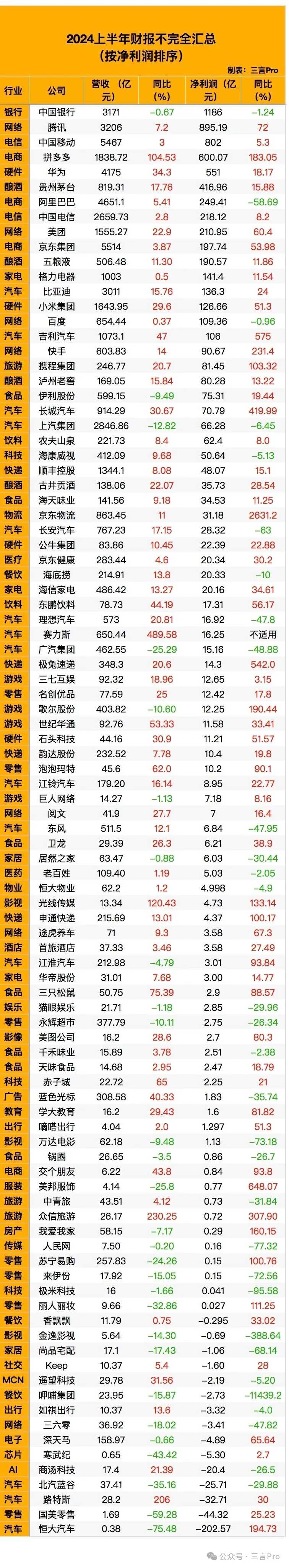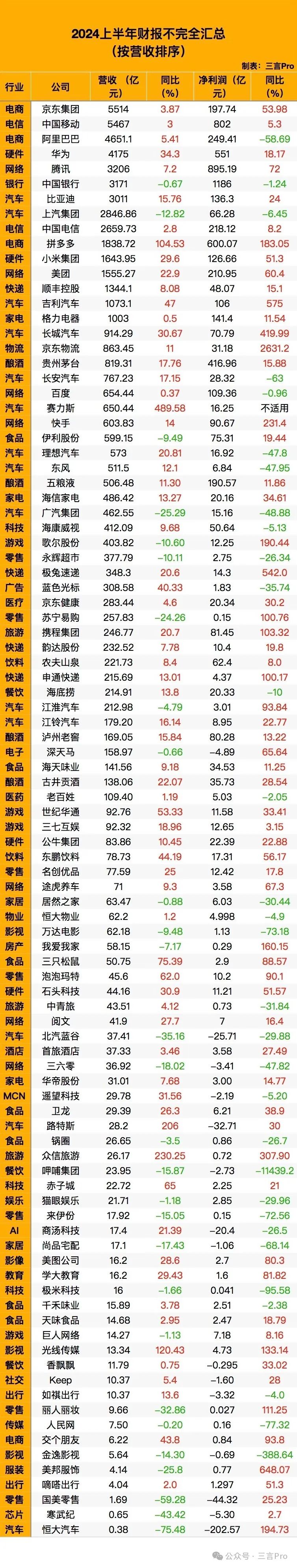 三言彙總了互聯網、科技、零售、汽車、旅遊、影視等行業為主的近百家上市公司半年報信息,並根據營收和淨利潤兩項維度進行排名。從中也能夠看出今年上半年各行各業發展情況。