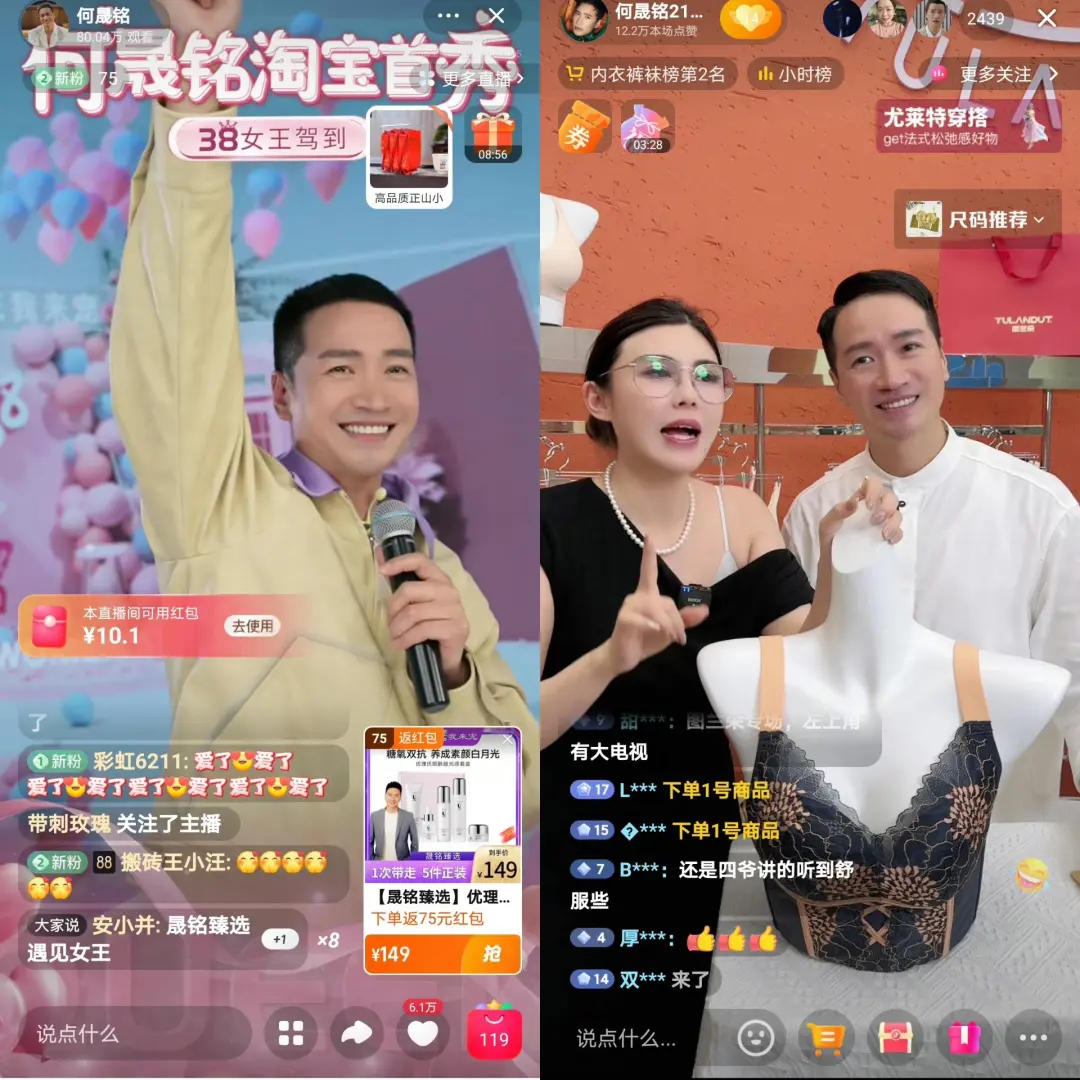 比起曾經被調侃是“直播間吉祥物”的明星,這批中年男明星已經能侃侃而談,熟練地直播帶貨。朱泳騰直接拉上自己76歲的母親,分享面部精華油的使用感和效果;何晟銘在直播間喊着“寶寶們”,舉着行李箱往下砸,證明質量過關;高梓淇則帶着粉絲走進珍珠產地諸暨,證明產地直銷,“把價格打到最低”……
