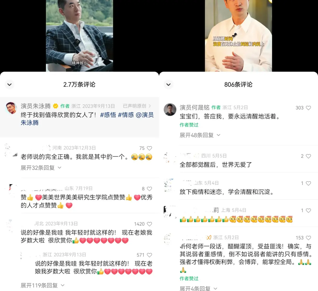 短視頻中,一位位穿着西裝、新中式服裝的男性在視頻中談論着女性覺醒話題,呼籲着女性愛護自己;評論區裏,無數中老年女性發出伴隨着鮮花、愛心和點贊等表情的評論,誇讚着主播帥氣,説話在理。