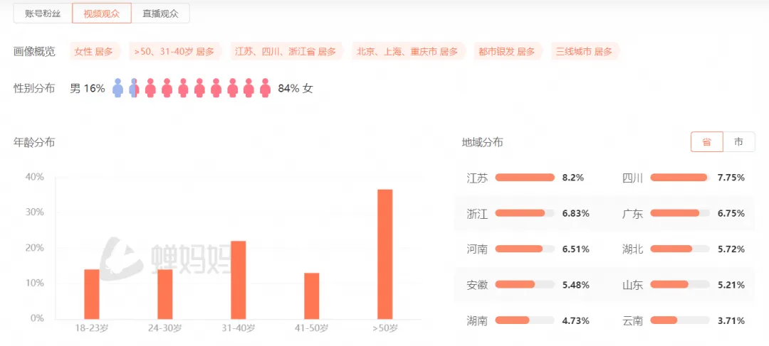 蟬媽媽數據顯示,何晟銘的視頻觀眾中,有83%為女性,有42.34%為31—40歲的用户;朱泳騰的視頻觀眾中,有84%為女性,36.71%為50歲以上的用户;任重的視頻觀眾中,有80%為女性,47.71%為31—40歲的用户。