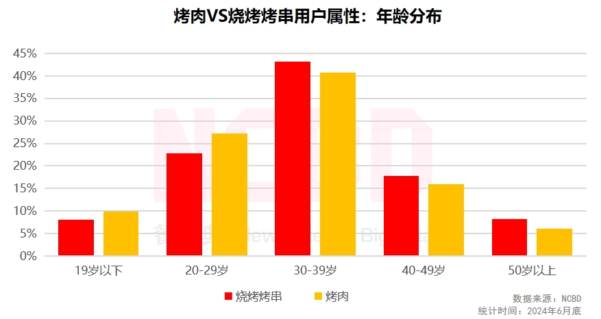 2、從年齡來看,烤肉的消費者羣體相對於燒烤烤串更為年輕;在29歲以下的羣體中,烤肉消費者的佔比要高於燒烤烤串消費者;在燒烤烤串的消費者中,30—39歲比例更高,是核心羣體。