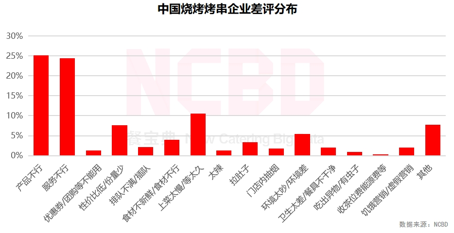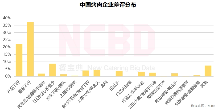 2、在烤肉類企業的差評中,服務方面差評最多,佔比高達37.0%,遠超燒烤烤串;服務與產品兩者的差評之和接近60%,高出燒烤10個百分點