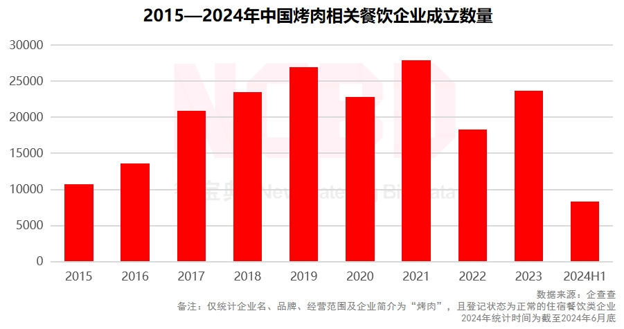 6、2023年,中國烤肉相關企業成立數量為2.4萬家,低於2021年的2.8萬家;2024年上半年,烤肉相關企業成立數量為8300家