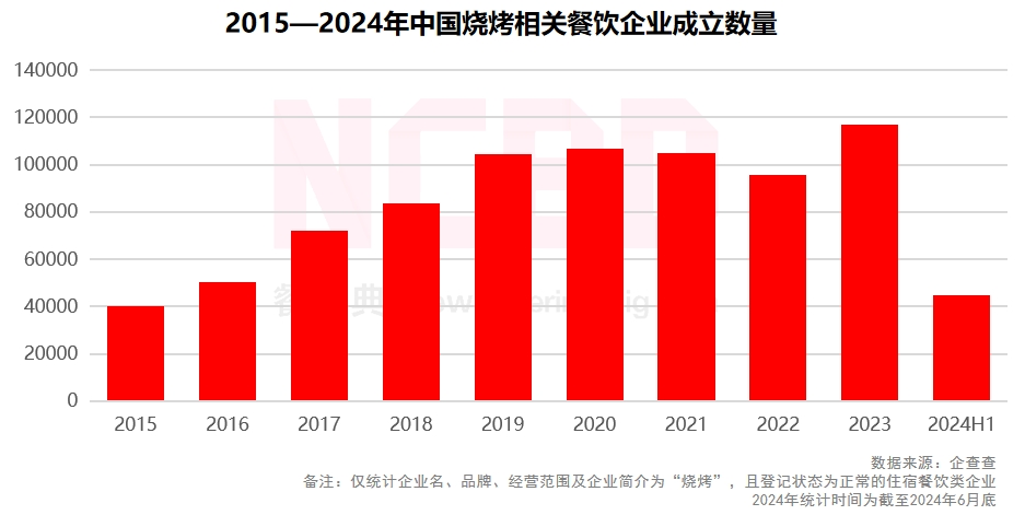 5、2023年,中國燒烤相關企業成立數量達歷年之最;2024年上半年,燒烤相關餐飲企業成立數量接近4.5萬家