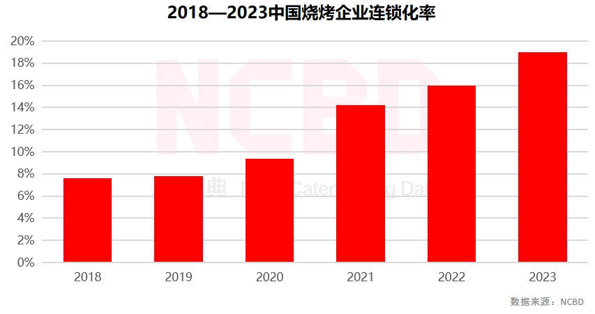跟茶飲、火鍋等餐飲品類的發展類似,燒烤也在朝品牌化與連鎖化的方向發展。品牌化有助於提升消費者的信任度和忠誠度,進而提升復購。具有較高知名度和良好口碑的品牌將更容易吸引消費者,獲得更大的市場份額。整個燒烤行業的連鎖化率未來也將不斷上升。
