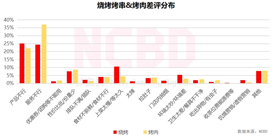 3、從燒烤烤串與烤肉的差評對比來看,烤肉對服務的要求更高,差評比例遠高於燒烤烤串;燒烤烤串在上菜速度、門店環境方面的差評比例要高於烤肉