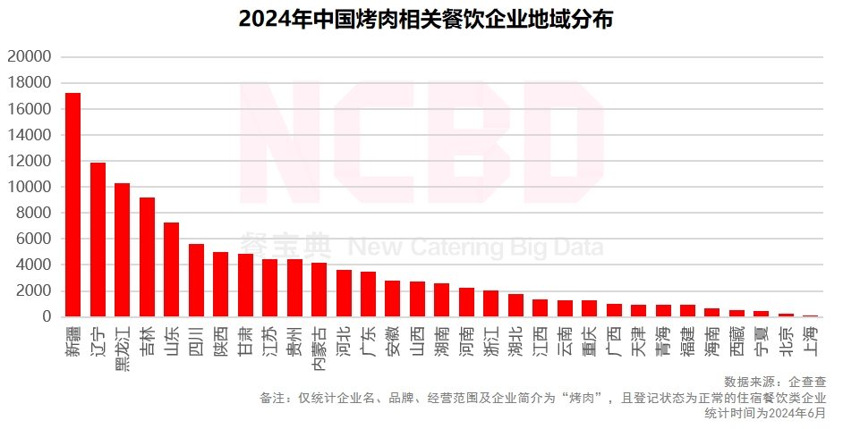7、從烤肉企業地域分佈來看,新疆的最多,數量超過17000家;遼寧、黑龍江與吉林三省的烤肉企業數量佔全國總量的27.2%