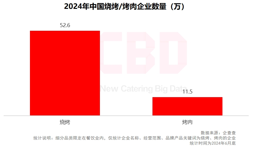 2、截至2024年上半年,全國有52.6萬家燒烤類餐飲企業,烤肉類企業有11.5萬家