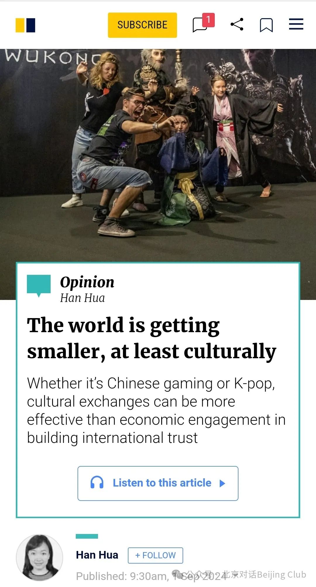 北京對話秘書長韓樺於9月1日在《南華早報》發表題為“世界正在變小,至少在文化上如此(The world is getting smaller, at least culturally)”的評論。她指出,儘管經濟全球化因政治互信缺乏而遭遇逆流,甚至影響到了正常民間交往,但是互聯網驅動的文化全球化成功“逆流而上”,甚至可能成為“再全球化”的新質推動力。