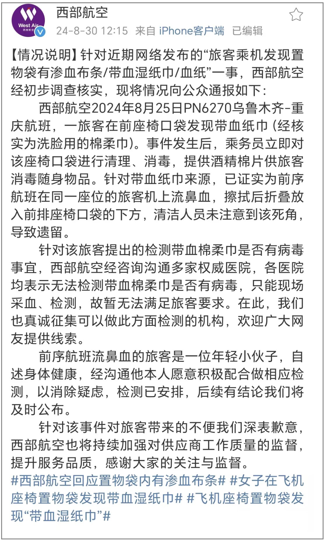 西部航空也就帶血棉柔巾是否可以檢測病毒的情況進行了説明,同時聯繫了前序航班流鼻血的旅客,其自述身體健康,願意積極配合做相應檢測以消除疑慮。