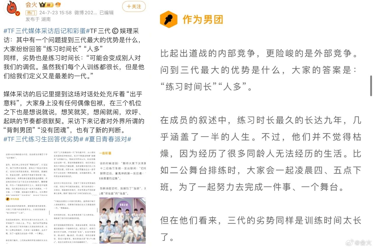 打着TF家族的旗號,養成系的模式本應吸納更多前輩們的家族粉,但三代和二代公開的時間過近,導致三代練習生很難繼承同期二代的粉絲,甚至因為後期二代成員要閉關參加高考無法聚齊、公司卻在提高三代在視頻物料中的比重,雙方粉絲產生過不少摩擦。去年有爆料稱時代少年團演唱會將有三代練習生表演舞台,二代粉絲還“一致對外”地表達過強烈的拒絕態度。