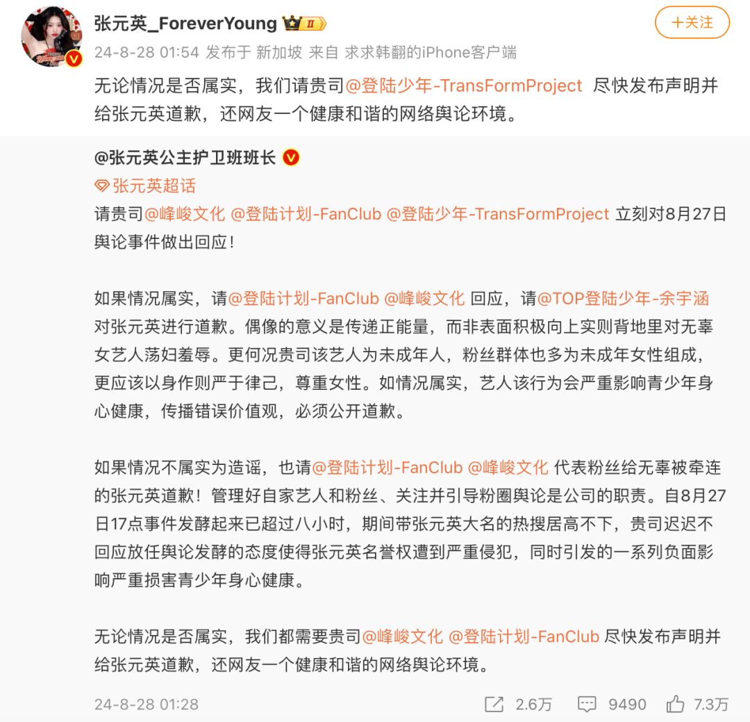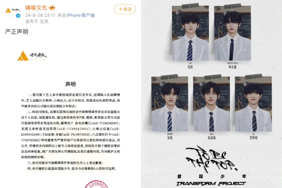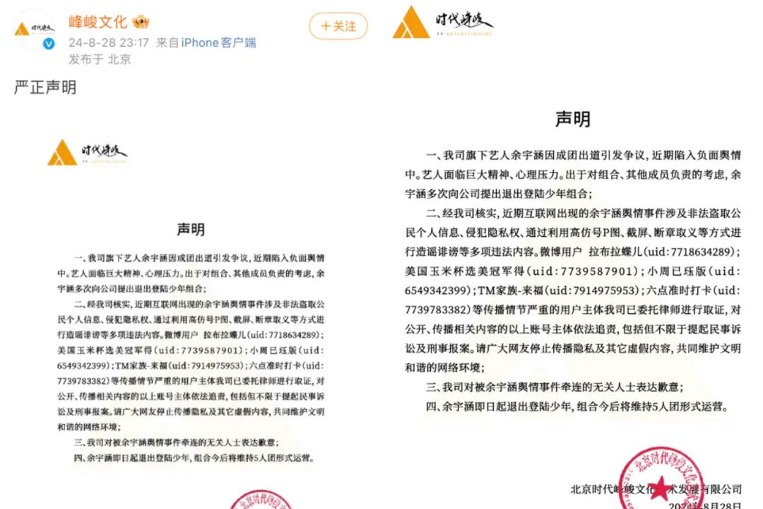 時代峯峻的聲明在8月28日晚發佈,聲明稱餘宇涵輿情事件涉及非法盜取公民個人信息、侵犯隱私權、利用高仿號P圖截屏斷章取義等方式造謠誹謗等多項違法內容,公司已委託律師對部分傳播內容的賬號主體進行追責,而餘宇涵本人因為負面輿情面臨巨大的心理和精神壓力,即日起退出登陸少年組合,之後出道團將以5人團形式運營。