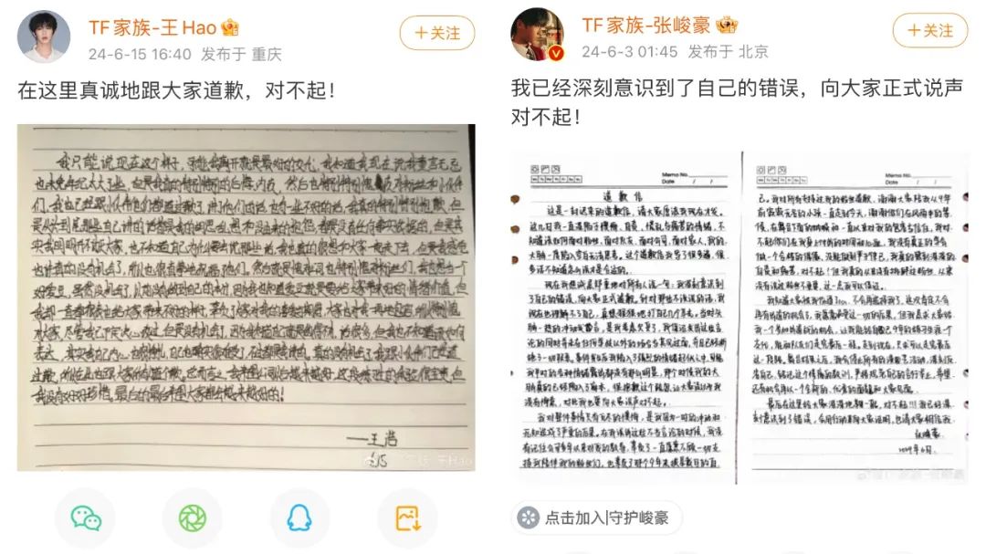 後續對這兩位練習生的處理情況是,王浩和張峻豪都在微博發佈了手寫道歉信,前者表明自己會退出TF家族,後者仍然會留下參加出道戰,但出道戰之後會暫停一切演藝事業。張峻豪沒有如三代粉絲要求“下樓”,導致當時有不少傳聞説他會是內定的三代出道組,粉圈對於出道戰的不滿再次加深。
