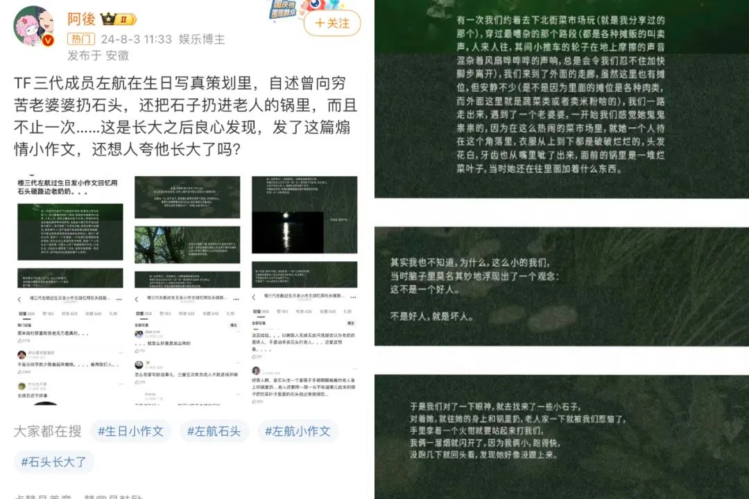 今年5月末,被視為出道戰種子選手的三代練習生左航,在生日作文中寫了一段童年的經歷,提到7歲時曾用石頭砸過困苦的老奶奶,在社交媒體平台發酵後登上熱搜,引起大眾爭議。