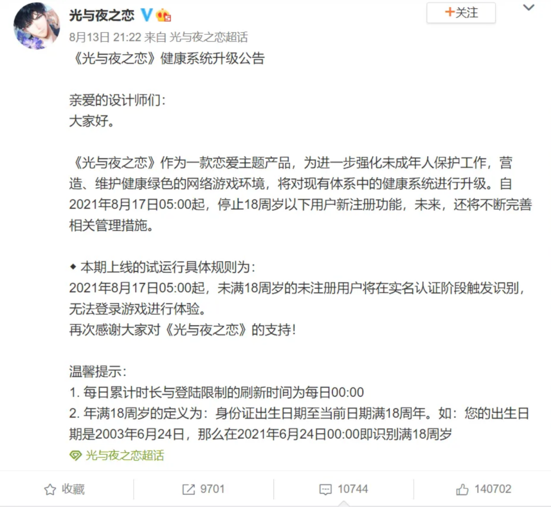 而且乙遊也是遊戲,遊戲行業對待玩家年齡向來非常嚴肅,乙遊更是早在21年就禁止十八歲以下的用户註冊。