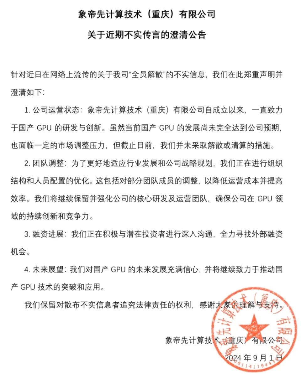 象帝先在公告中表示,象帝先自成立以來,一直致力於國產 GPU 的研發與創新。雖然當前國產 GPU的發展尚未完全達到公司預期,也面臨一定的市場調整壓力,但截止目前,我們並未採取解散或清算的措施。