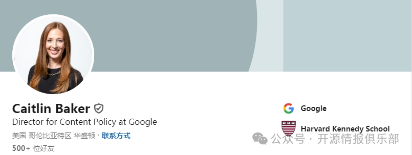 Facebook的戰略響應全球總監也曾是一名戰爭研究專業的學生,同時也在美國喬治敦大學就讀(美國中情局的間諜學校:沃爾什外交學院)。畢業後,凱特琳·貝克(Caitlin Baker)在華盛頓國防部長辦公室從事中東反恐政策工作,並在白宮國家安全委員會擔任約旦和黎巴嫩主任。