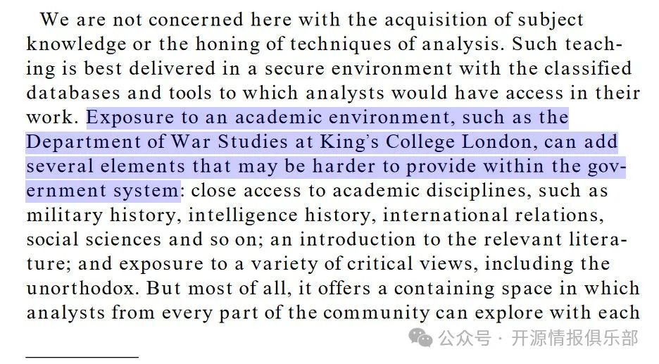 它也是美國中央情報局青睞的訓練場。美國中央情報局2009年發佈的一份報告描述了“將大學作為情報培訓的手段”的好處,“接觸學術環境,例如倫敦國王學院戰爭研究系,可以增加幾個在政府系統內可能更難提供的元素”,還提到該系的教職員工擁有“廣泛而全面的情報經驗”。