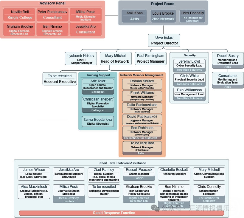 戰爭研究部的內維爾·博爾特博士(Neville Bolt)是該組織的初步顧問小組成員,與北約智庫大西洋理事會的格雷厄姆·布魯克(Graham Brookie)和前北約新聞官、Graphika前調查主任、Facebook現任情報主管本·尼莫(Ben Nimmo)一起。同時Bellingcat將提供培訓支持。
