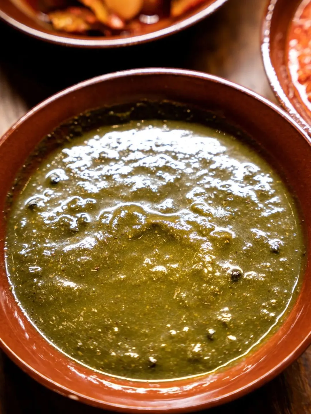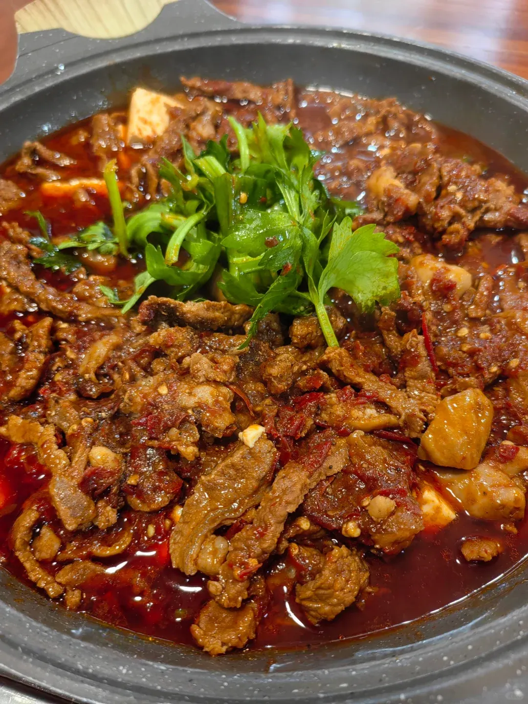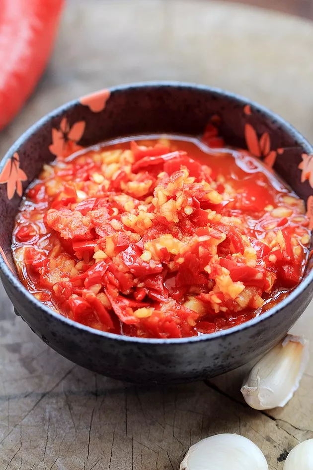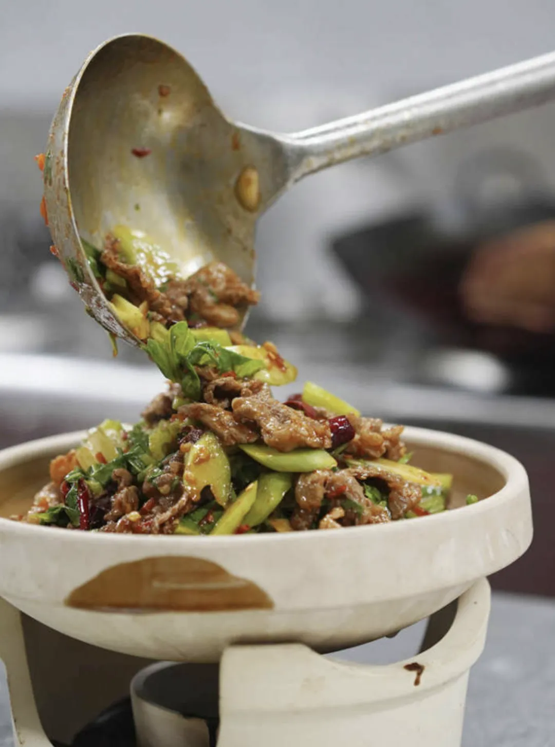 在酸湯裏燙熟的牛肉要蘸上特製的糟辣椒+青辣椒+折耳根蘸水,真正的地道吃法才算是圓滿達成。