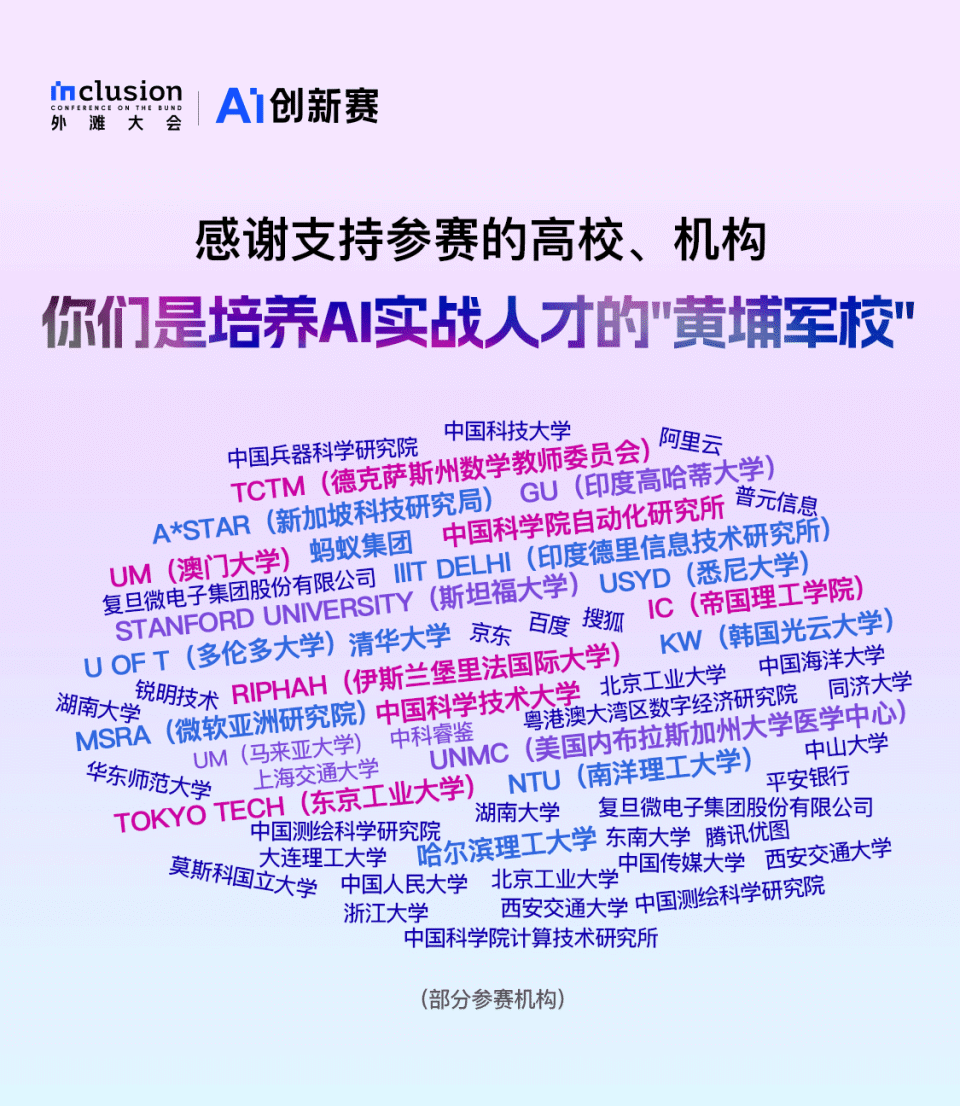 外灘大會賽事主辦方透露,兩大分賽共吸引了來自超過20個國家和地區的7000多支參賽隊伍、近萬名選手參與。包括世界頂級高校如北京大學、復旦大學、斯坦福、麻省理工學院、新加坡國立大學,以及來自微軟、谷歌、美團、小紅書等知名企業、中科院自動化研究所、微軟亞洲研究院、新加坡科技研究局等科研機構的團隊參加。