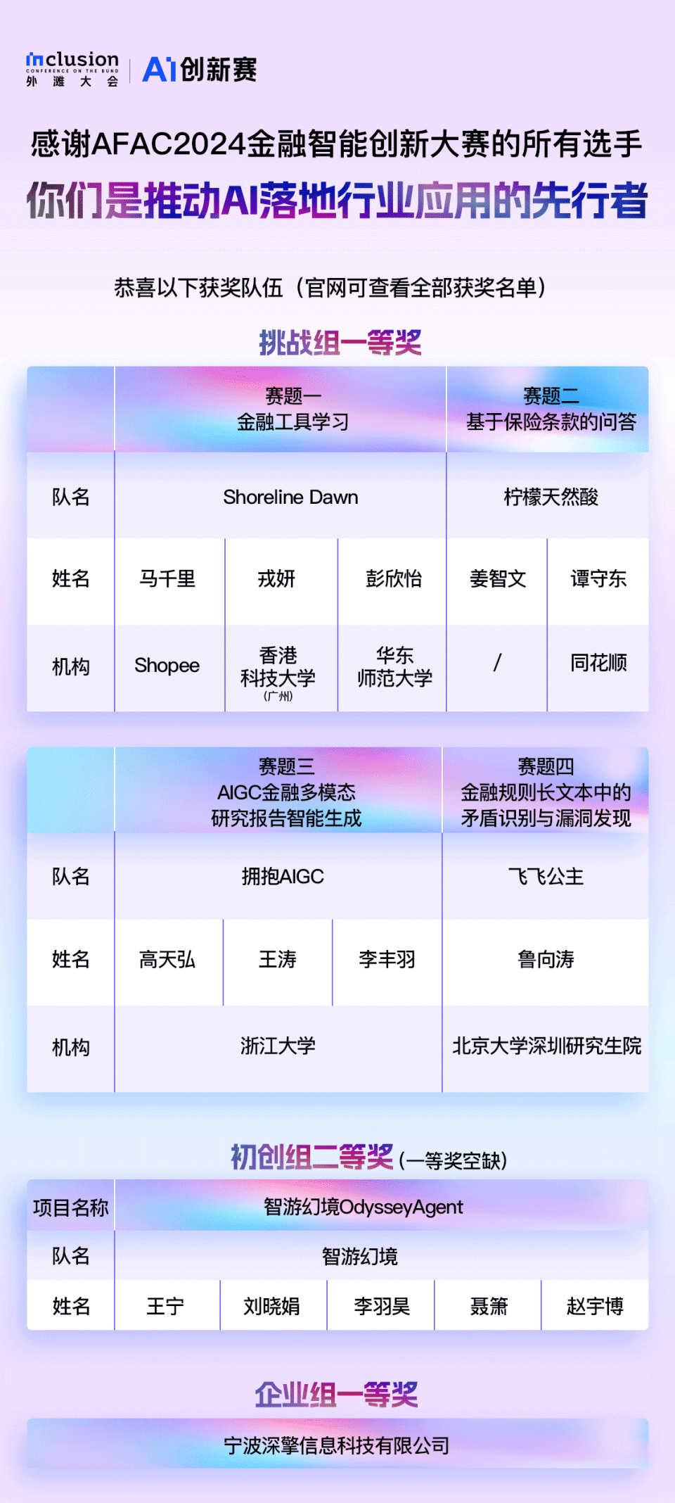 AFAC賽設挑戰組、初創組、企業組三個組別,挑戰組面向開發者,選手將基於大賽提供的金融科技領域真實數據,解決業務場景問題。初創組面向創業團隊或種子企業,面向金融、科技、生活等場景開發示例應用,設計商業方案。企業組面向金融科技行業的中小微企業,選手將着眼於金融科技行業的新興方向,提報有亮點、有新意的新技術、新產品落地項目。賽事成果涵蓋醫療健康、金融科技、智能製造等多個熱點領域,體現了AI技術的廣泛應用潛力,讓AI不僅於“CHAT”(聊天),走入實際應用“ACT”(服務)。