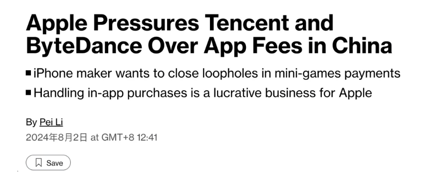 此前有報道稱,蘋果公司正在加大對騰訊、字節跳動的施壓力度,要求兩家公司配合封堵微信、抖音中的支付漏洞,並稱如果不取消開發者和用户繞過蘋果生態的能力,未來將拒絕提供微信更新。