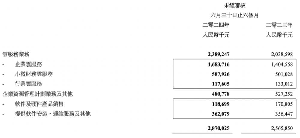 按照業務構成劃分,金蝶國際主要有云服務業務、企業資源管理計劃業務及其他兩大板塊,其中雲服務業務收入為23.9億元,2023年同期為20.39億元,同比增長17.2%,佔總營收的比例為83.2%,而2023年同期佔比為79.5%;企業資源管理計劃業務及其他收入為4.81億元,2023年同期為5.27億元,同比下降約8.8%。