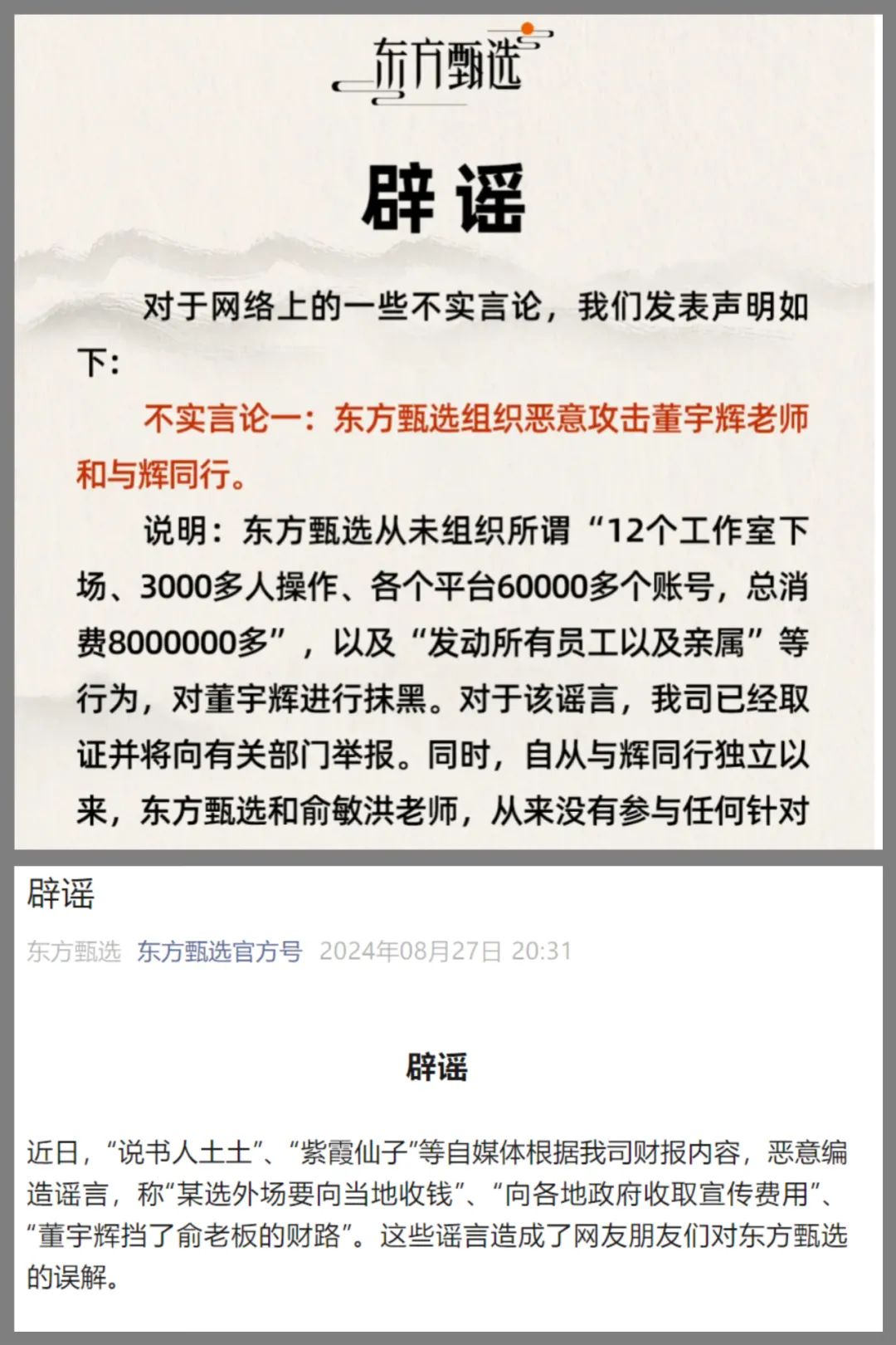 東方甄選發佈兩則闢謠公告, 圖源東方甄選官方微信公眾號