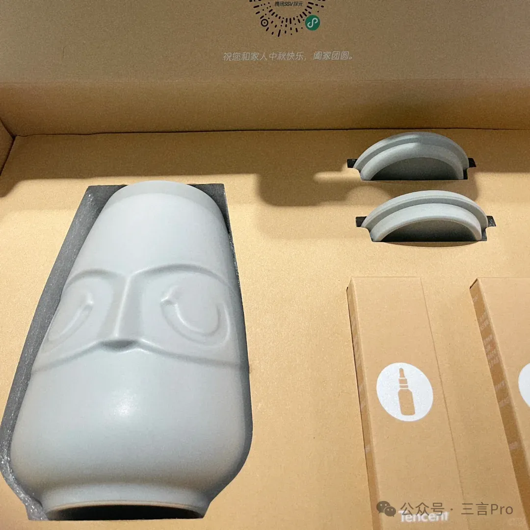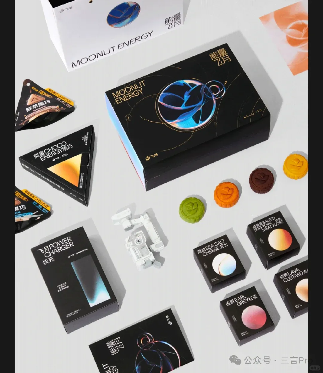 飛書禮盒有一個閃極與《流浪地球2》聯名的MOSS手辦充電器,就是圖中白色手辦。其他還有黑巧和月餅。