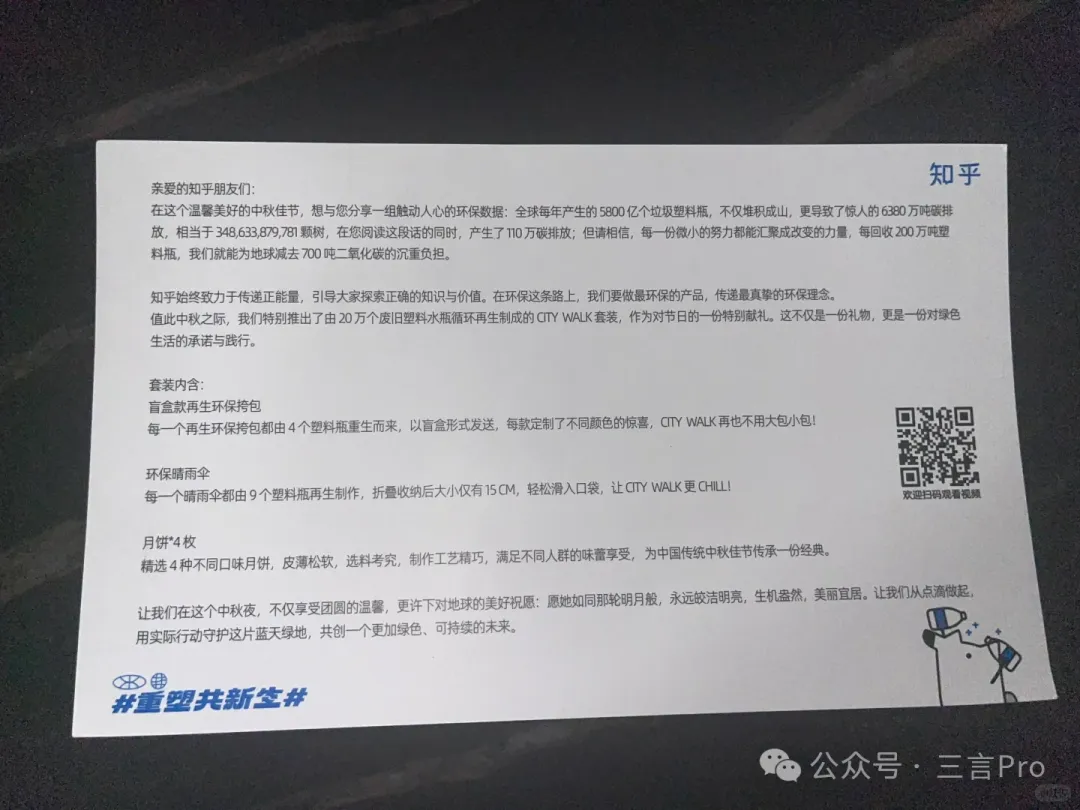 不過,這次知乎的禮盒主打環保理念,包和雨傘都是由塑料再生製作,還是挺有意義的。