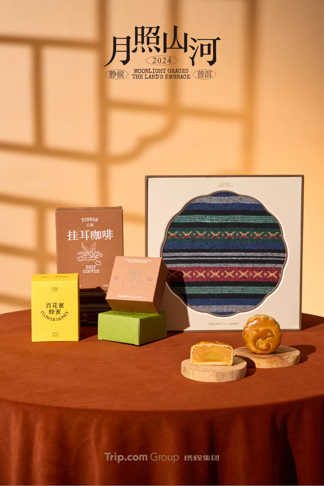 攜程今年禮盒主打民藝風物,以傳統工藝結合現代設計,製作織錦畫框、風味月餅、掛耳咖啡、百花蜂蜜、地方特刊。