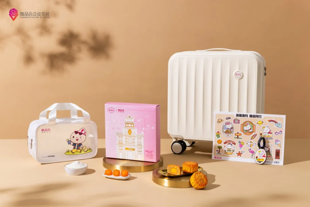 唯品會以“追星逐月,唯品同行”為主題,中秋禮盒裏有行李箱、洗漱包、月餅和diy貼紙。馬卡龍的配色看起來還是比較明亮舒服的。