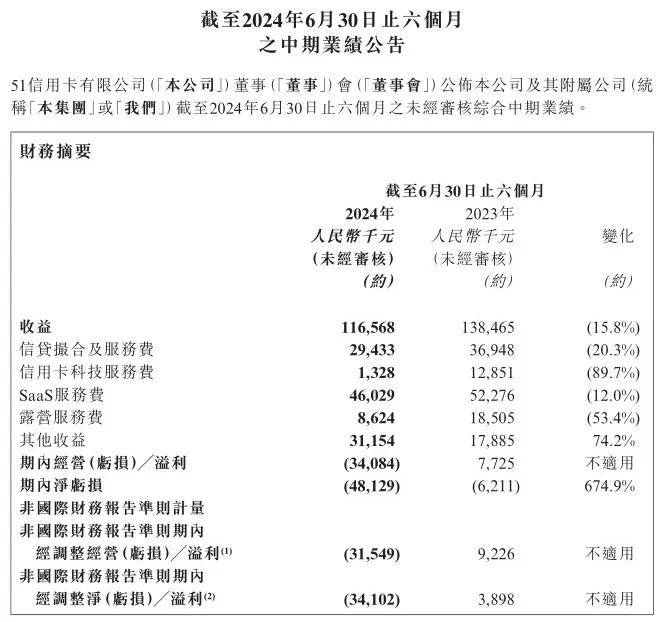 8月23日,51信用卡發佈截至2024年6月30日止六個月的中期業績。