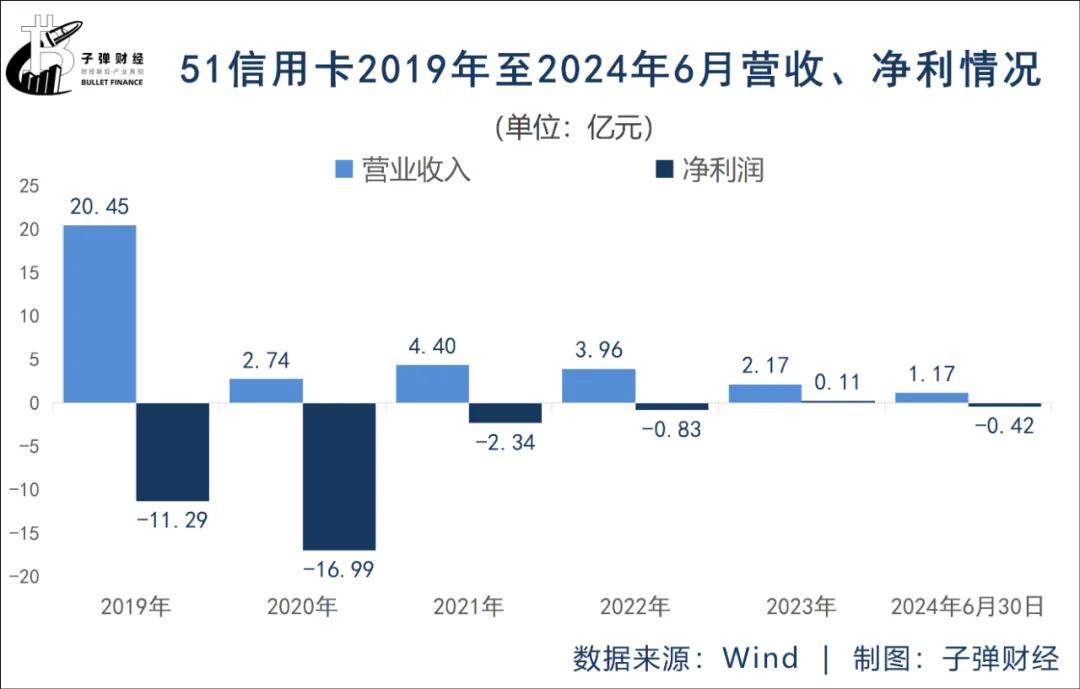 2019年至2023年,51信用卡分別實現營業收入20.45億元、2.74億元、4.40億元,3.96億元、2.17億元;淨利潤分別為-11.29億元、-16.99億元、-2.34億元、-0.83億元、0.11萬元,這5年中僅在2023年實現微弱盈利。