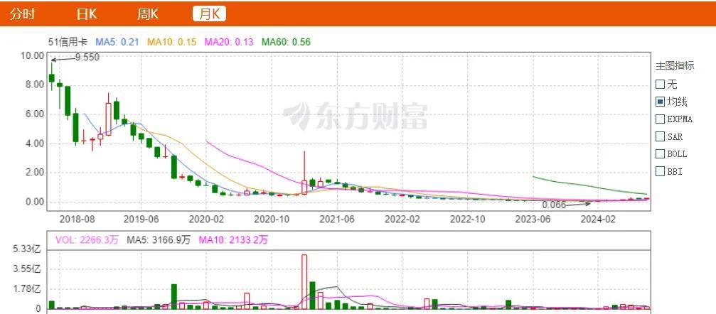 51信用卡上市之初股價曾一路漲至9.55港元/股,市值一度超百億港元。但此後股價一路走低。