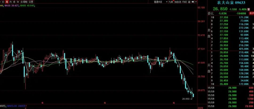 繼8月28日因財報導致股價暴跌10.43%後,9月2日開盤後,農夫山泉再度迎來大跌,收盤時股價為26.85港元/股,全天跌幅為5.46%,市值跌至3020億港元。從5月初到9月2日,農夫山泉的股價跌幅已超40%。