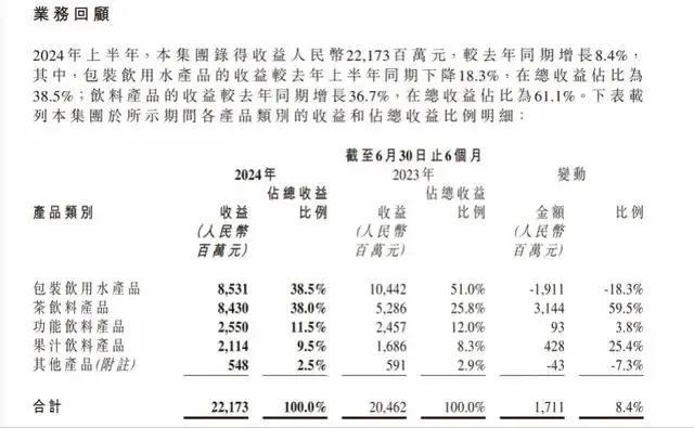 農夫山泉業績虧損最厲害的業務板塊,是包裝飲用水產品。年中報顯示,營收佔比以往高達50%的包裝飲用水產品,上半年營收大幅下挫18%至85.31億元。