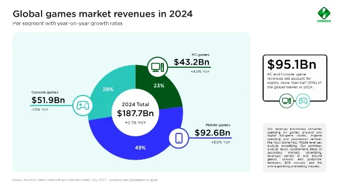 國產廠商衝擊PC平台的理由並不複雜,在移動端用户增長陷於停滯、紅利逐漸消失的當下,所有人都在尋找擴大玩家羣體的機會。據Newzoo的統計,2024年增長最快的是PC平台,比去年增長了4.0%,成為推動遊戲產業增長的動力來源。此外PC/移動端玩家與主機端玩家的重合度也很低,只有26%的玩家只使用PC或移動設備,而不使用主機玩遊戲。