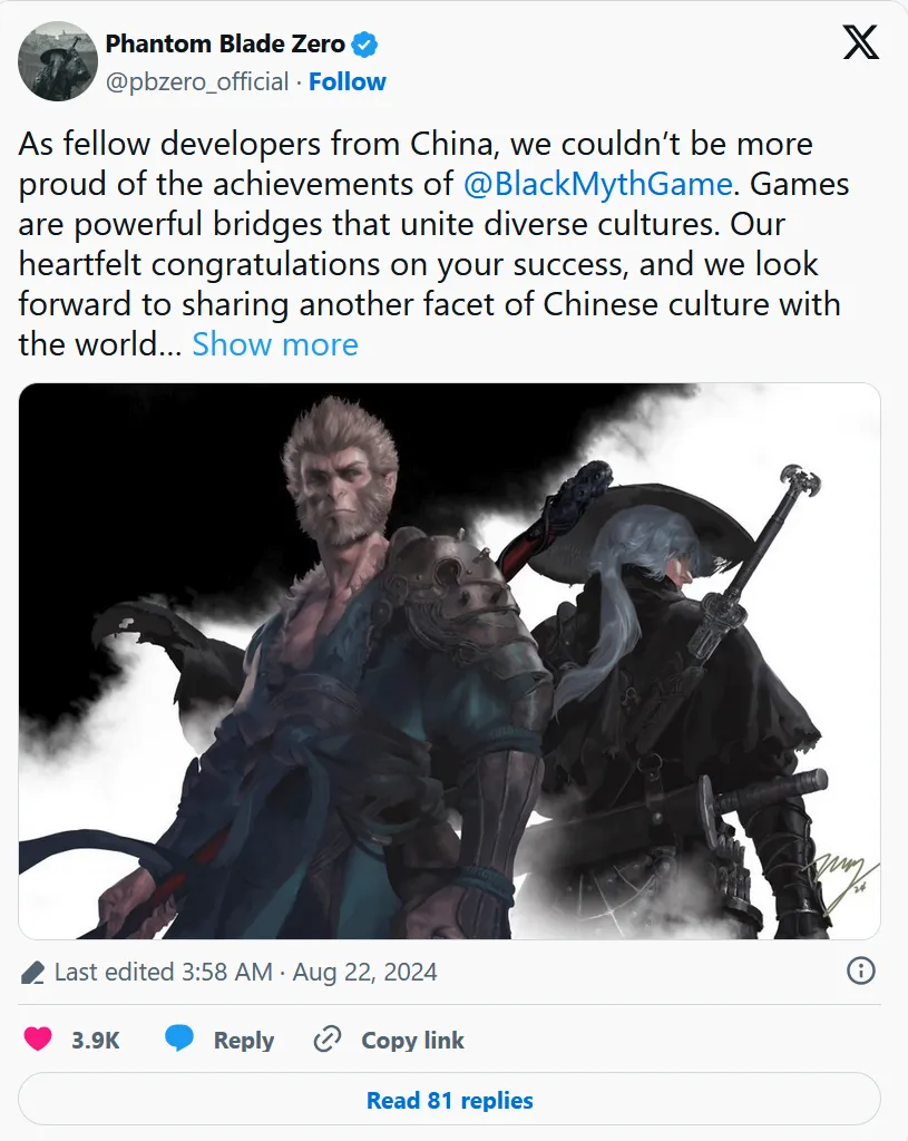 米哈遊的《絕區零》,網易的《永劫無間》都是市場表現亮眼的產品。靈遊坊的《影之刃:零》在參展同時還不忘發推祝賀《黑神話:悟空》的成功。看到黑神話做買斷製做成了,原本在付費模式上有所猶豫的影之刃零,不知道會不會改變主意,最終下決心做買斷制。